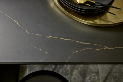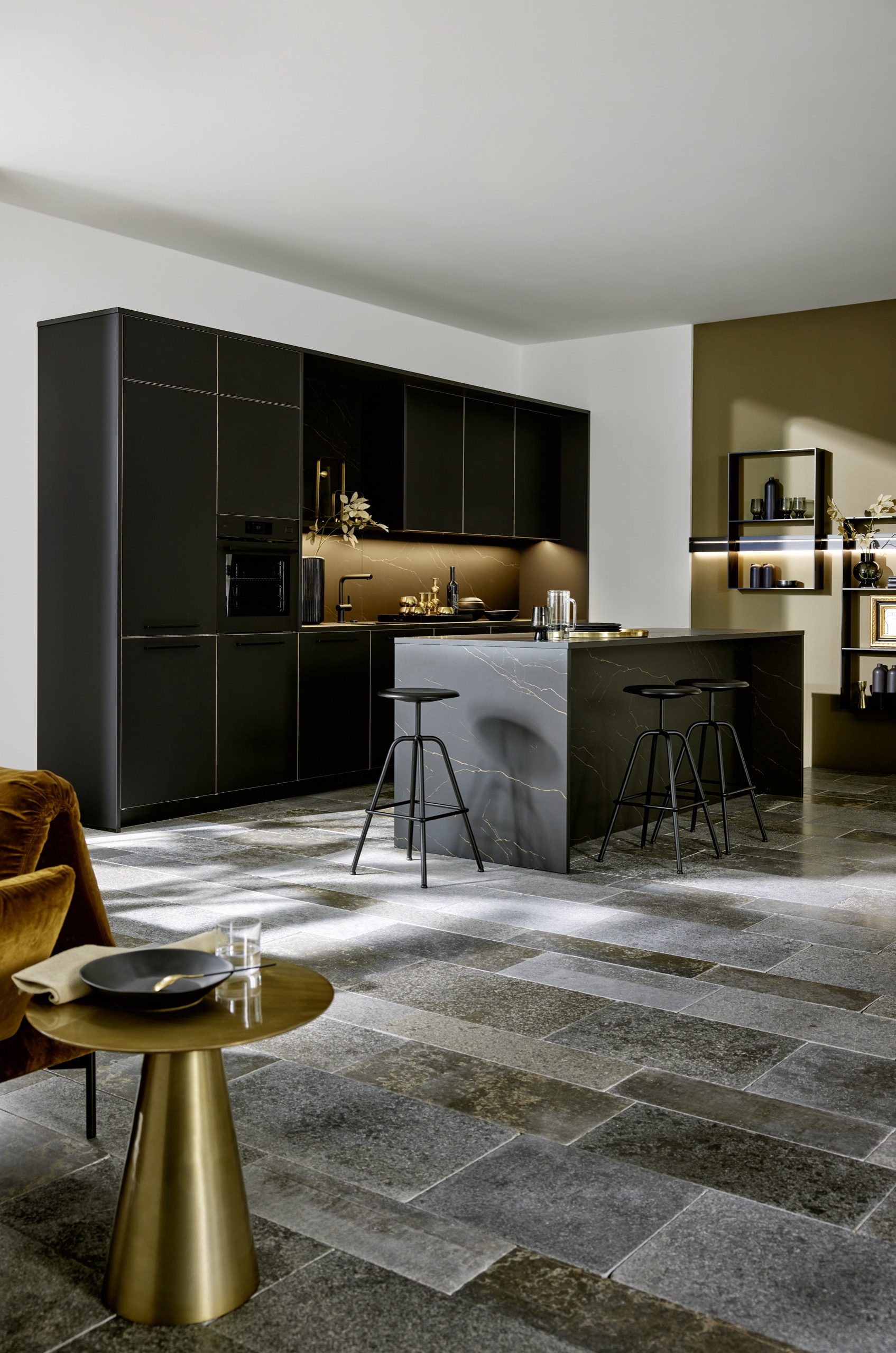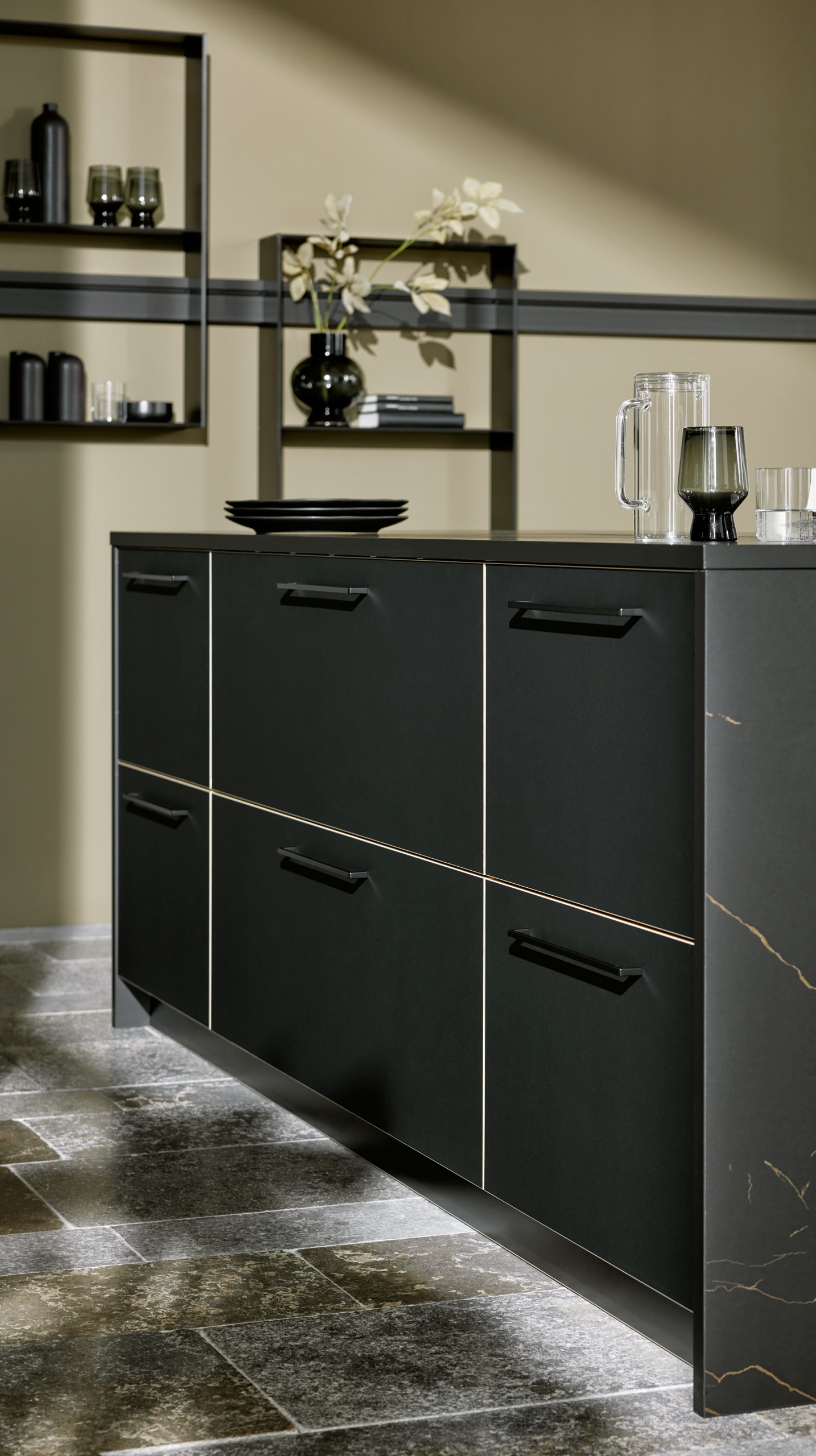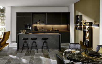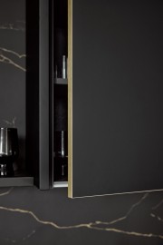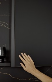 Глубокий черный цвет фасадов может быть подчеркнут контрастной деревянной окантовкой, которая добавляет акцент на геометрии и фактуре. В представленном проекте их дополняет столешница с графичным светлым мраморным рисунком на черном фоне, что создает гармоничный и целостный образ, подчеркивая современный и элегантный характер интерьера.