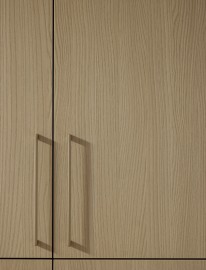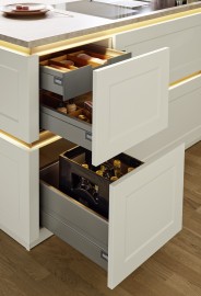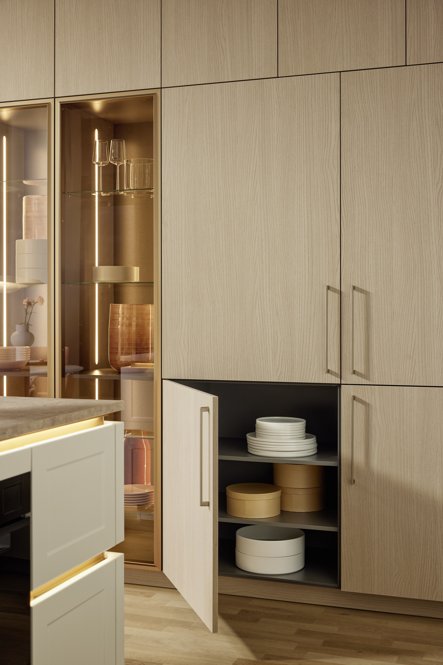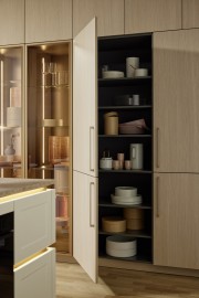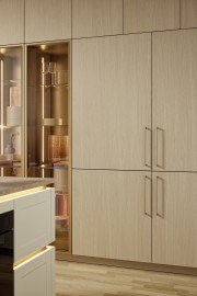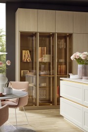 Особенностью модели является высокая эргономичность. Встроенная бытовая техника, включая холодильник, скрыта в высоких колоннах, отделанных декором светлого дерева, что позволяет эффективно использовать площадь и сохранить безупречный внешний вид. Легкость и изящество интерьеру придают стеклянные витрины с бронзовой рамкой и подсветкой, идеальные для демонстрации изысканной посуды.