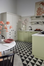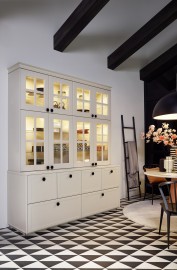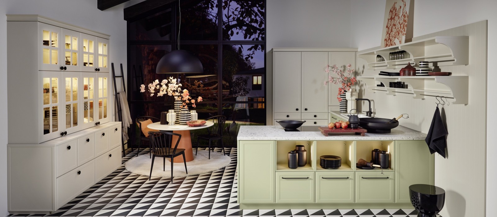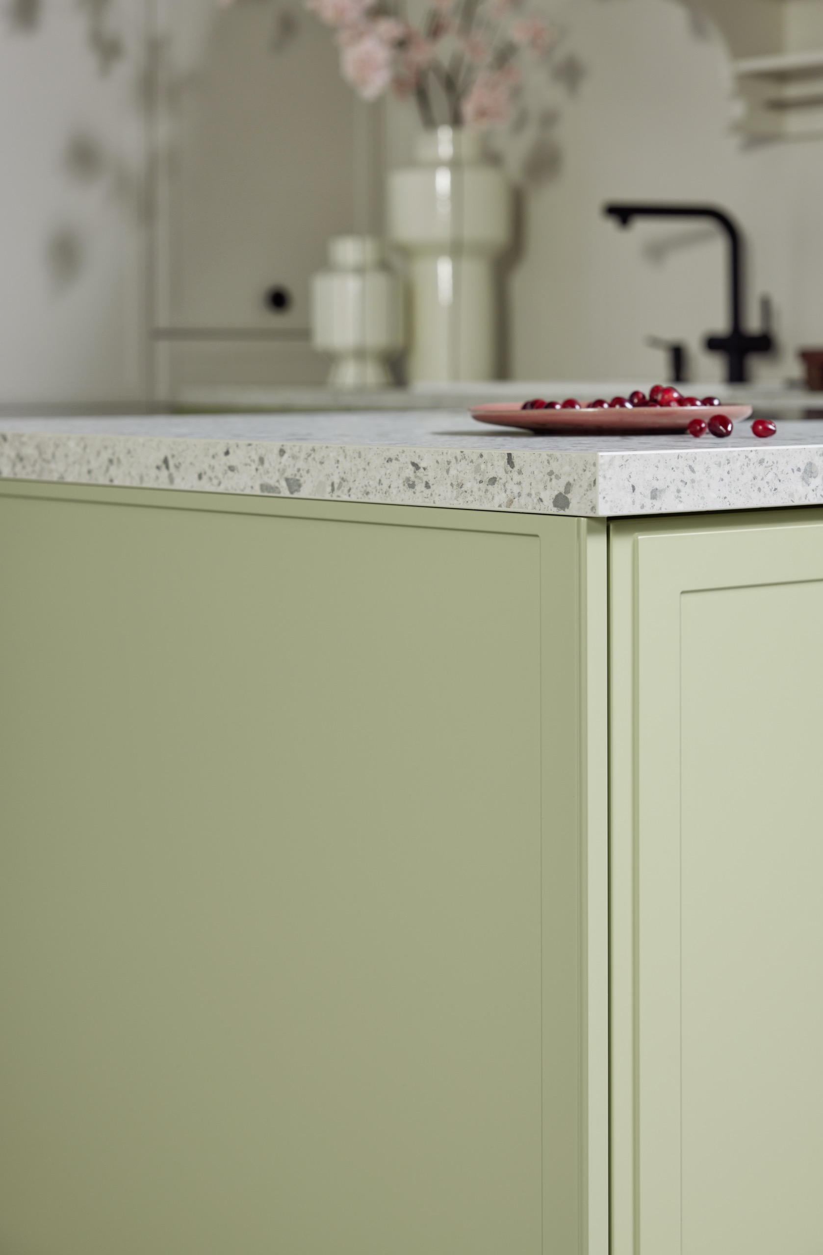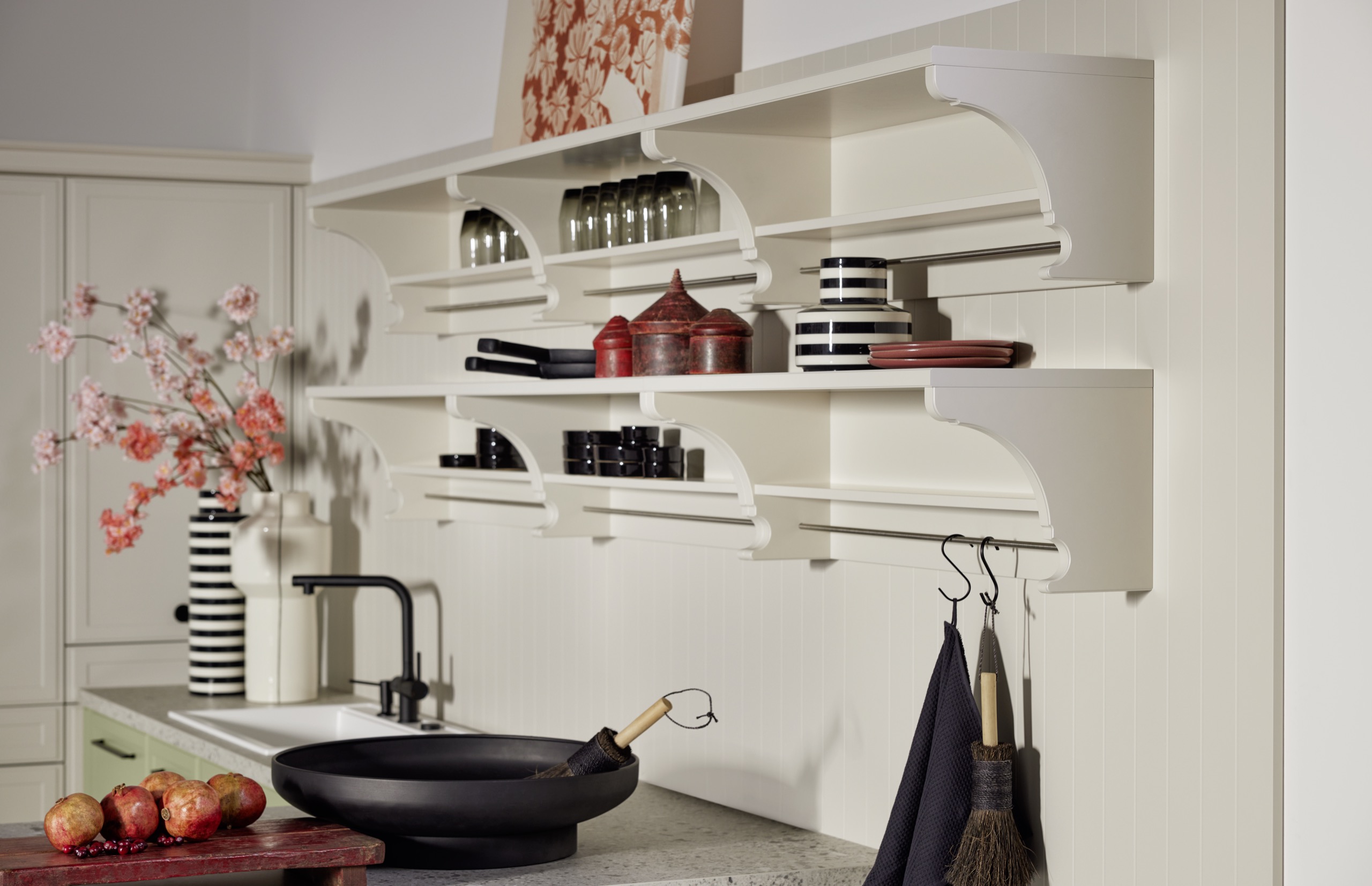 Основу проекта составляет оригинальное прочтение классических рамочных фасадов. Высокие колонны в духе стиля «Прованс» выполнены с использованием рамок, окрашенных в успокаивающий цвет «кашемир», что формирует мягкий и нейтральный фон. Эффектную деталь добавляют стеклянные витрины слева с деревянным обрамлением и внутренней подсветкой, идеально подходящие для демонстрации фарфора. Под ними расположены лакированные ящики в том же оттенке, сохраняющие единство стиля. Современную ноту вносят акцентные черные ручки круглой формы, соединяющие в себе классическую форму и современный вид.
