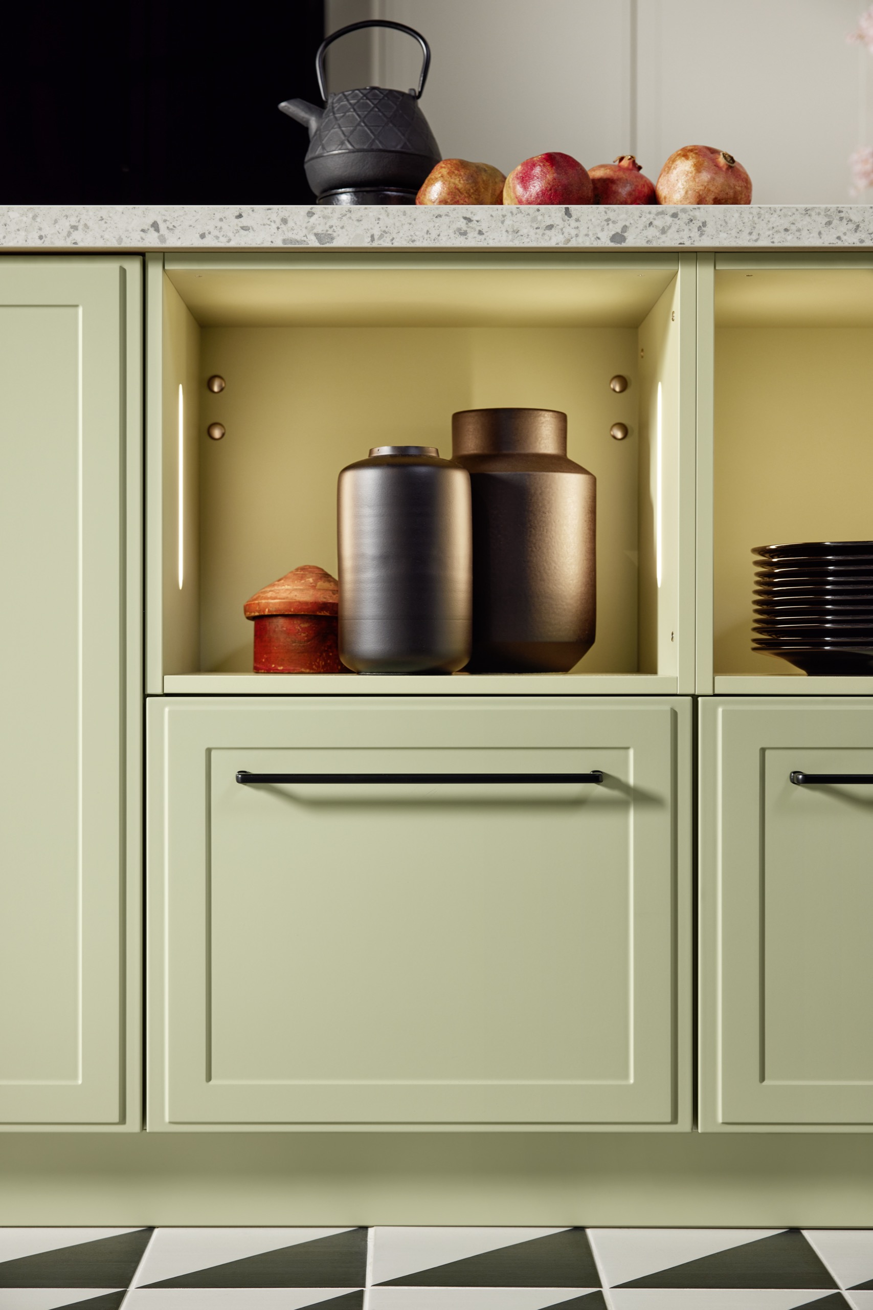 Ярким акцентом служит центральный остров и нижние модули, выполненные в сочном цвете «авокадо». В центре расположены открытые ниши с подсветкой для декора или часто используемых вещей. Над рабочей поверхностью размещены классические навесные полки для посуды, завершающие образ в стиле прованс.