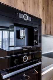 Кухня Nolte Nova Lack | Legno выполнена в современном стиле с использованием контрастных фактур: глянцевые лаковые фасады в цвете Магнолия и натуральный шпон дуба Трюфель. Использование светлых оттенков и натурального дерева в интерьере гостиной и столовой группы позволило визуально объединить жилую и рабочую зоны помещения в единое целое. Зонирование пространства реализовано за счет барной стойки. Безручечные системы открывания ящиков и шкафов не нарушают лаконичность и изысканность форм. Шкафы-витрины со встроенной подсветкой смягчают переход от кухни к жилой части. Верхний ярус скрывает вентиляционную систему. Нижний ряд шкафов имеет Г-образную планировку, что позволило увеличить объем рабочей поверхности, не нарушив при этом общую концепцию кухни. Для удобства пользования данной зоной в нижние панели навесных шкафов установили встроенные светодиодные светильники.