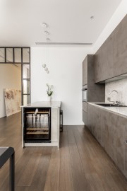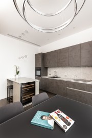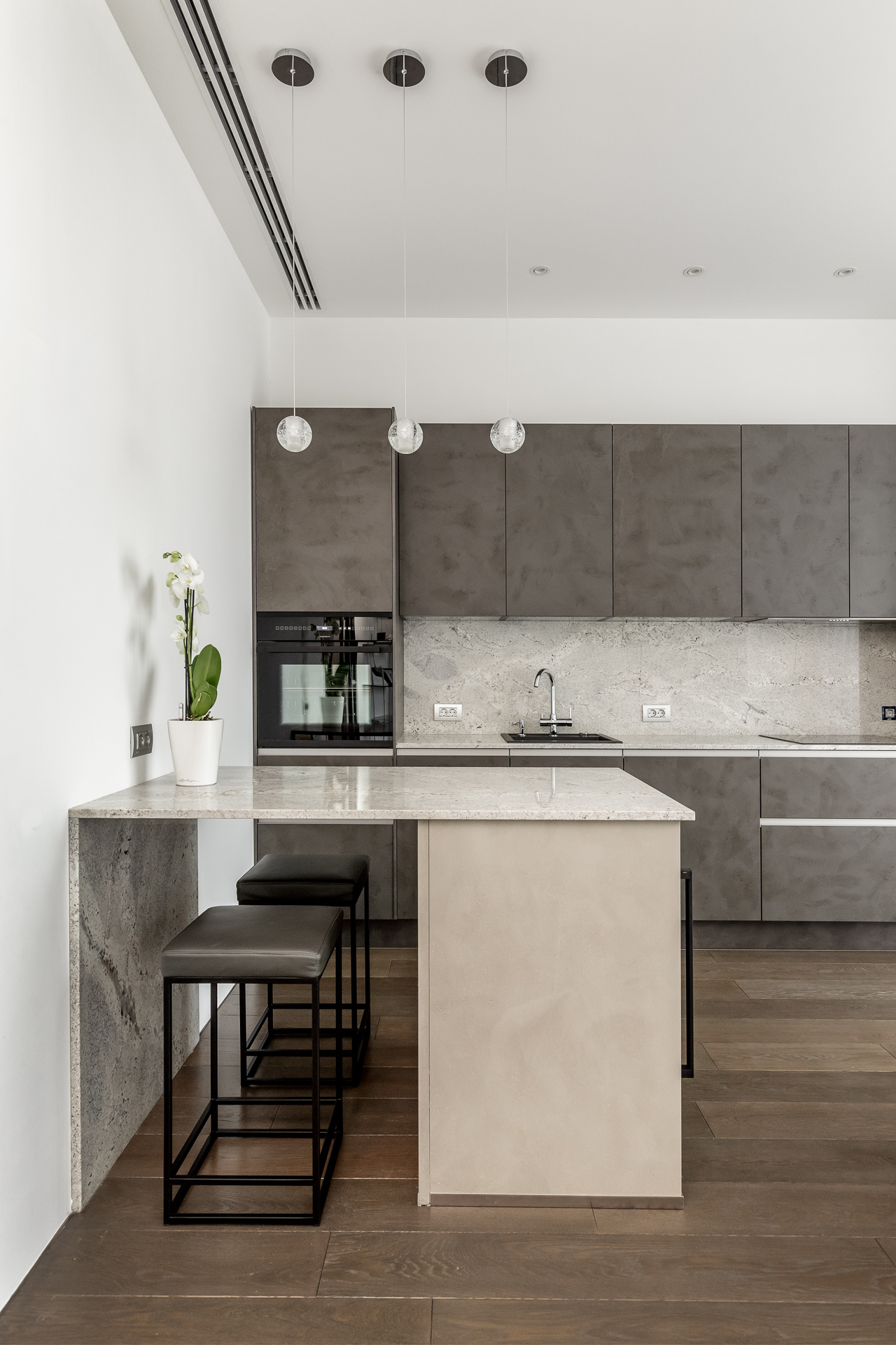 Данный проект разработан с учетом интеграции кухни в жилое пространство. Островной блок с дополнительной посадочной зоной смягчил переход между рабочей зоной, столовой и гостиной. Кухня Nolte Portland спроектирована в современном стиле. Кухонные фасады произведены из бетона и сверху покрыты матовым лаком, оттенки – серый агат и антрацит. Каменные столешницы и панели с природным рисунком смягчают строгие лаконичные формы, привносят в помещение атмосферу уюта. Безручечные системы открывания позволили избежать перегруженности интерьера лишними деталями. Выдвижные ящики и часть шкафов открываются за счет интегрированных металлических ручек-профилей, остальные элементы – за фасад. Дополнительная посадочная зона в рабочей зоне реализована за счет удлиненной столешницы. Светодиодные светильники, врезанные в днище верхних шкафов, обеспечивают дополнительное освещение рабочей поверхности. В торец островного блока встроили винный шкаф. Внутреннее пространство укомплектовано системами организации пространства от Nolte Kuechen. Данный проект реализован в 2017 году.