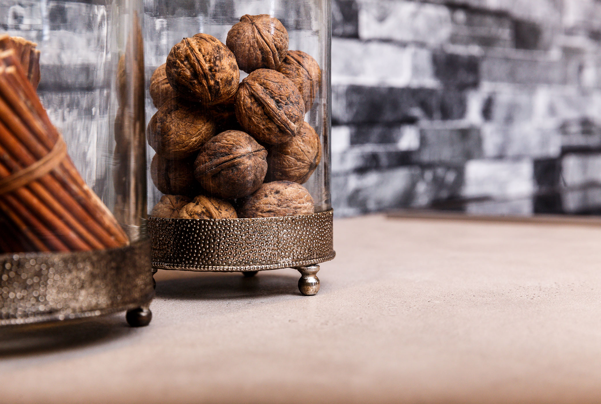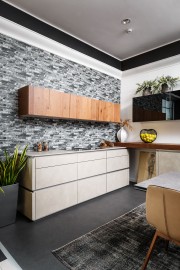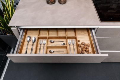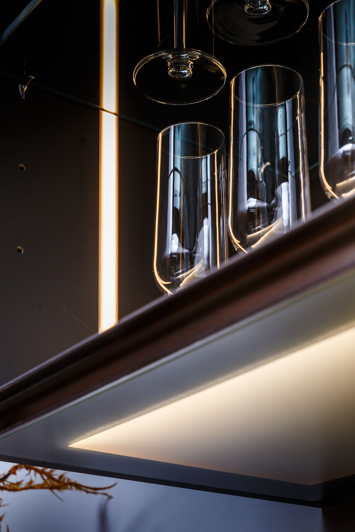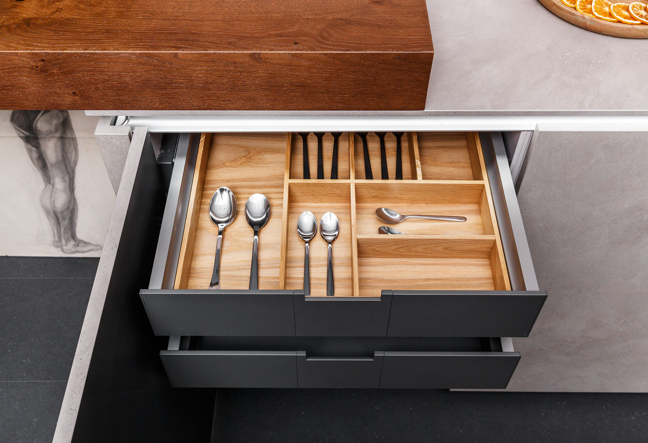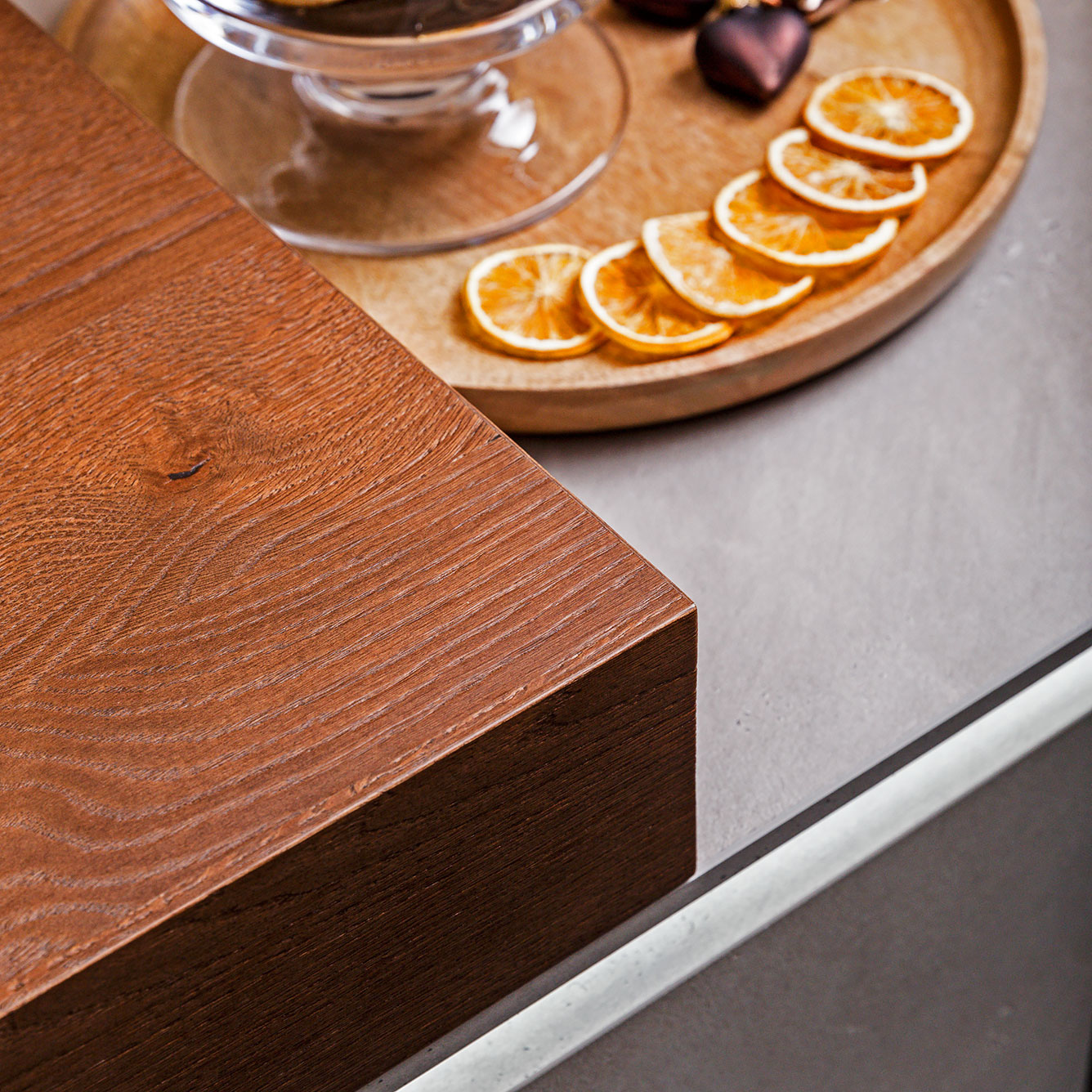 Архитектура кухни Nolte Portland | Nova Lack | Legno выгодно подчеркивает каждый материал, который использовали в данной модели. Фасады напольных баз произведены из бетона оттенка серый агат. Часть навесных шкафов изготовлена из шпона дуба Марон, часть – это шкафы-витрины из черного тонированного стекла. Для глянцевых лакированных поверхностей высоких колонн выбрали оттенок серый кварц. Массивный барный топ и стеллаж, встроенный в ряд высоких колонн, произведены из шпона дуба. Супертонкие столешницы придают нижним шкафам более жилой вид, декор столешниц подобрали под кухонные фасады. Высокие шкафы открываются за счет системы push-to-open, остальные – за фасад. Металлические цоколи с зеркальным эффектом делают кухонную архитектуру более легкой. Навесные шкафы укомплектованы стеклянными внутренними полками и встроенными системами освещения. Выдвижные ящики укомплектованы системами хранения из массива дерева. Чтобы минимизировать количество деталей в интерьере, варочную панель выбрали с интегрированной вытяжкой. Духовой шкаф встроили в открытый стеллаж.