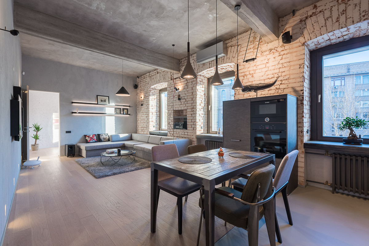 Модель Nolte Stone спроектирована для помещения, объединившего в себе сразу несколько функциональных зон: кухню, столовую и гостиную. Кухонные фасады, изготовленные из матового меламина с фактурой Basalt, прекрасно гармонируют с общим интерьером в стиле лофт. Чтобы избежать контраста, столешницу выбрали с тем же декором, что и кухонные фронты. Ряд навесных шкафов облегчили за счет дверей со вставками из черного стекла. Для повышения удобства пользования рабочей поверхностью по всей ширине стены установили профильную светодиодную подсветку. Полуколонны со встроенным духовым шкафом и СВЧ разместили рядом со столовой группой. Напольные элементы открываются за счет металлических ручек. В навесных шкафах используется безручечная система открывания. Дизайнер проекта – Марина Денисова.