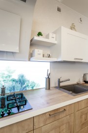 Кухня Nolte Vienna спроектирована для помещения, объединенного с гостиной зоной. Открытые элементы и разноуровневые конструкции делают интерьер более живым и динамичным, смягчают переход между рабочей и жилой частью помещения. Традиционные рамочные фасады с фактурой дуба Шале привносят атмосферу домашнего уюта и тепла, а белоснежные фронты визуально расширяют пространство. Угловая планировка позволила увеличить площадь рабочей поверхности и зоны хранения. Чтобы избежать перегруженности интерьера, часть бытовой техники встроили в шкафы с глухими фасадами. Интегрированная обеденная зона позволила сэкономить пространство. Стеновая панель с фотомотивом Glas herbs, расположенная за газовой плитой, выполнена из ударопрочного закаленного стекла и оборудована встроенной LED-подсветкой. Массивные столешницы декорированы кантом контрастного белого оттенка. Открывание ящиков и шкафов осуществляется за счет изящных металлических ручек. Данный проект реализован в 2015 году.