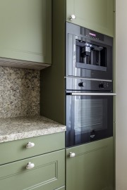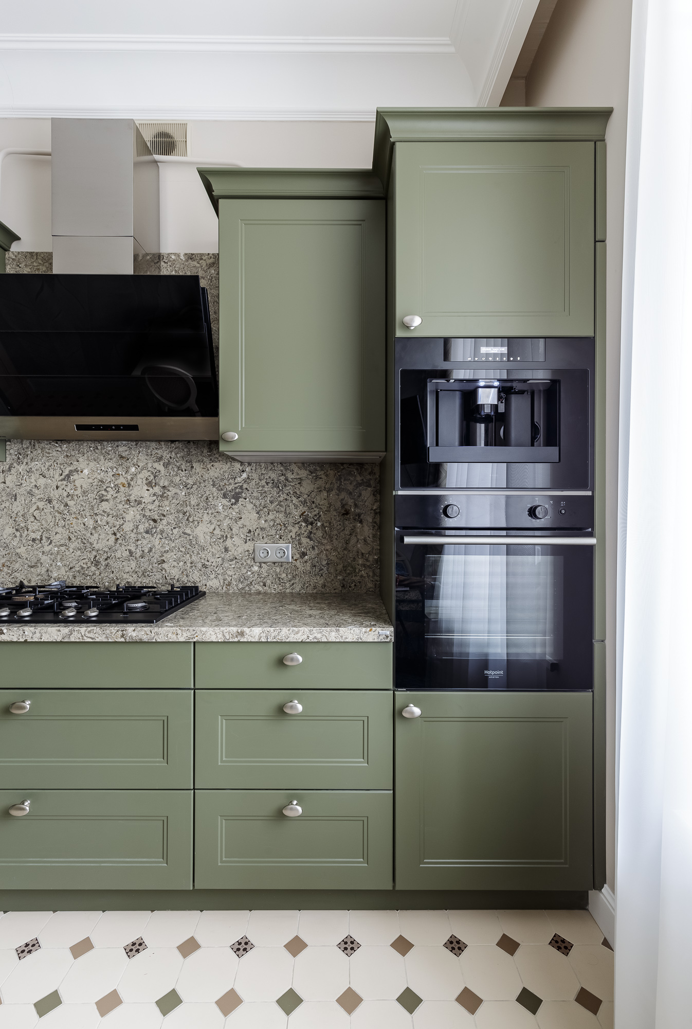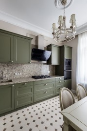 Данный проект был реализован в рамках программы Идеальный ремонт для народного артиста СССР и легендарного диктора ЦТ Игоря Леонидовича Кириллова. Кухня Windsor Lack в современном классическом стиле спроектирована для помещения, объединившего в себе рабочую и столовую зоны. Фасады с декоративной прямоугольной филенкой выполнены в оттенке Олива, отделка — матовый лак. Для удобства пользования рабочей поверхностью навесные шкафы выбрали с меньшей глубиной, в нижние панели встроены LED-светильники. Удобные ручки-кнопки прекрасно вписались в общий интерьер. Посудомоечную машину и холодильник встроили в шкафы с глухими фасадами. Духовой шкаф и кофемашину установили в колонну. Данный проект реализован в 2018 году. Дизайнер проекта – Татьяна Горшкова.